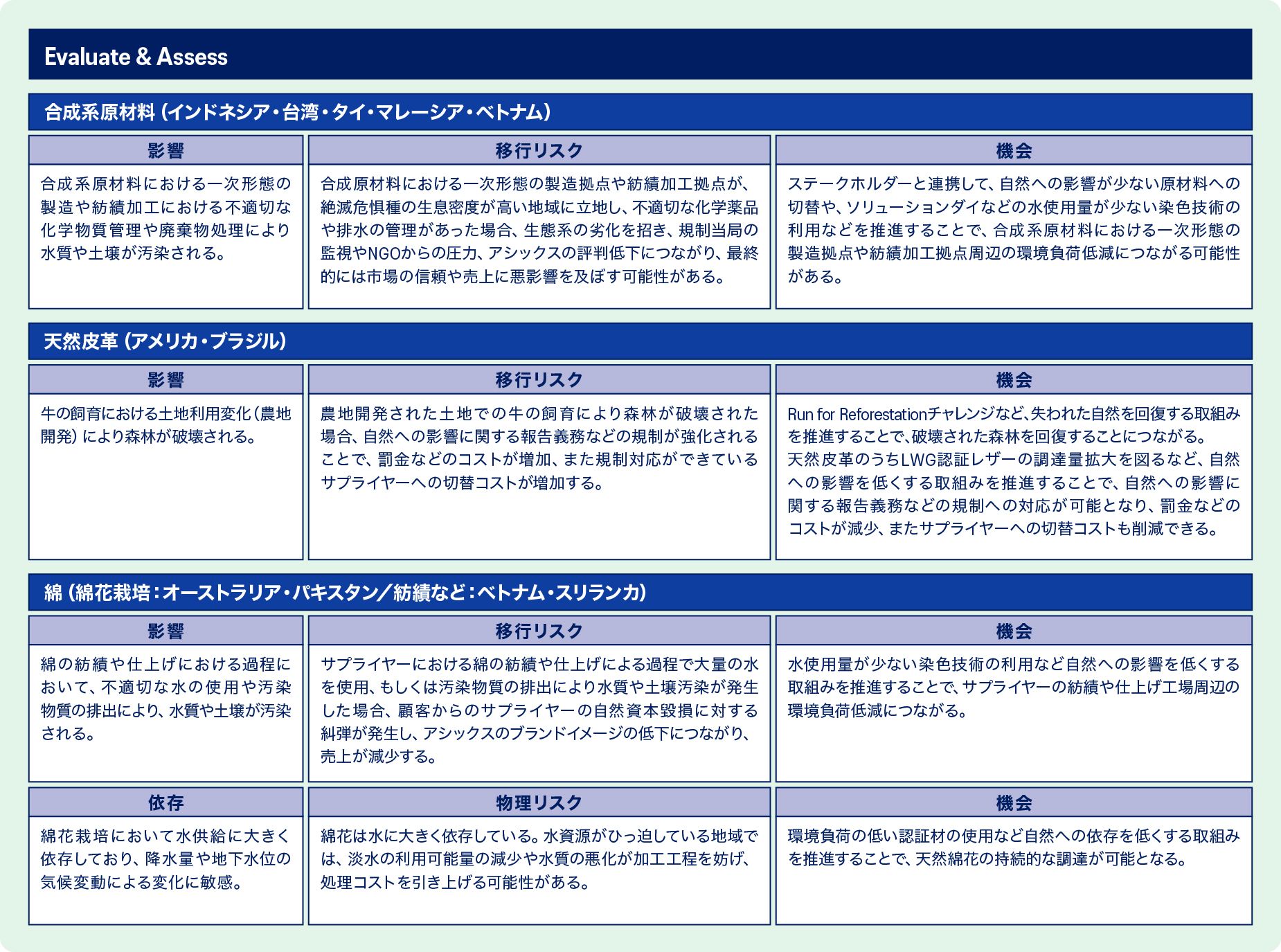 原材料についてアシックスはフットウエアをメインとした事業であり、調達量の大半を合成系原材料(合成ゴム、合成樹脂、ポリウレタン、ポリエステル)が占めています。生物多様性に特に影響のある、綿や天然皮革の調達量は限定的ですが、TNFD※1が発表した「TNFD提言」を参考に、2025年にLEAP分析※2を実施し、アシックスが自然に与える影響と自然への依存を把握しました。