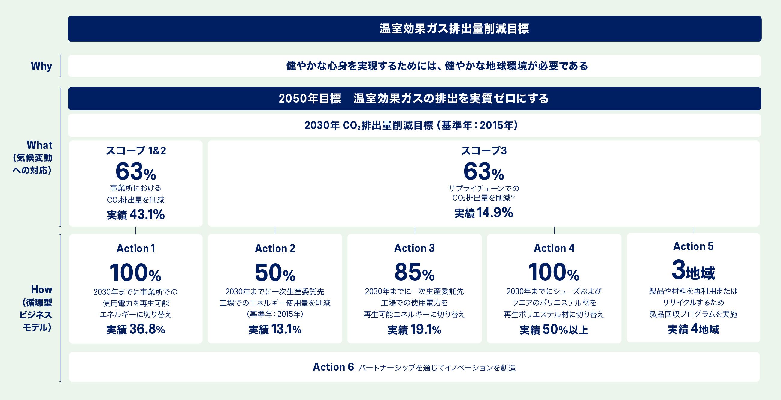 アシックスは、産業革命前からの気温上昇を1.5℃未満に抑え、2050年までに温室効果ガスの排出を実質ゼロにすることにコミットしています。事業活動における再生可能エネルギーの使用拡大や、エネルギー使用量の削減など、様々な目標やアクションを設定し、推進しています。